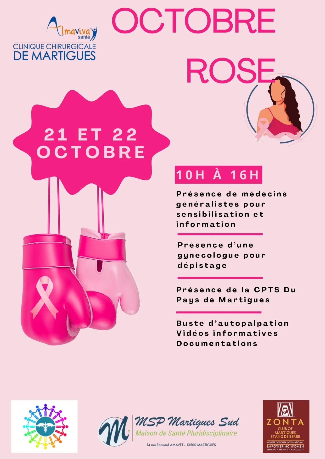 Le Mardi 21 et le Mercredi 22 Octobre, la Clinique Chirurgicale de Martigues, la MSP de Martigues Sud et le club Zonta de Martigues Etang de Berre sont partenaires dans l'organisation de Journées d'information, sensibilisation et dépistage auprès de toutes les femmes qui se présenteront en entrée libre à la clinique.